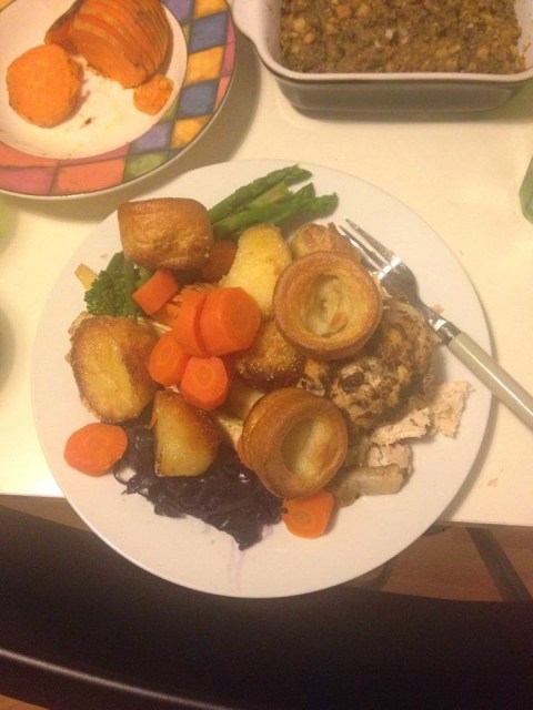 Doing Christmas dinner for the house was a good exercise in budgeting this year, as I do tend to go a little overboard, but with the limited capacity of a student house and loan, it’s nearly impossible to do anything too luxurious. This year, I made a massaman-style roast chicken, roast potatoes (which, if I do say so myself, are unbeatable), spiced red cabbage, carrots, broccoli, asparagus, green beans, yorkshire puddings, honey-roasted parsnips, roasted sweet potatoes, mushroom stuffing and onion gravy. For our vegetarian friend I made a stuffed roasted pepper, as well. I forgot to take photos while I was cooking, and the lighting in our living room is pretty awful, but I promise it was nicer than it looks! This was the end result (apologies for the bad photo):