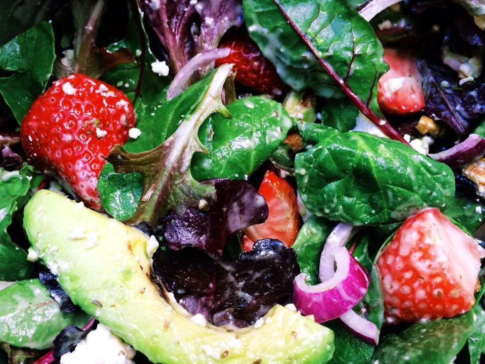 Gently add the strawberries, avocado and red onion to the babyleaf and toss.