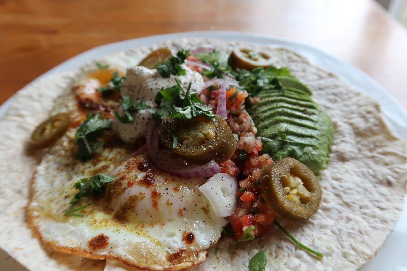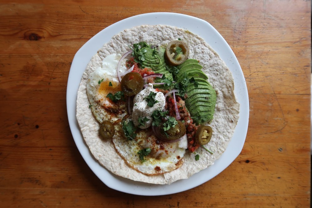 4. Place your eggs on top of your toasted tortilla, and top with pico de gallo, creme fraiche, avocado jalapenos, and chopped coriander. Finally, season to your taste and enjoy!