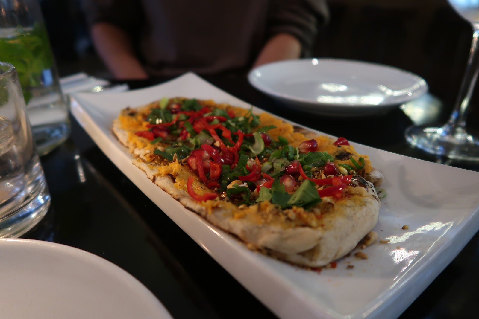 I was ENTIRELY UNPREPARED for the out-of-body experience I had while eating this flatbread. A perfectly spongy bread, topped with creamy butternut squash houmous, sharp and juicy bursts of pomegranate seeds and an aromatic dukkah topping, garnished with fresh chillies and coriander. And a sharp, almost sherbet-y drizzle of some kind? It was delicious.