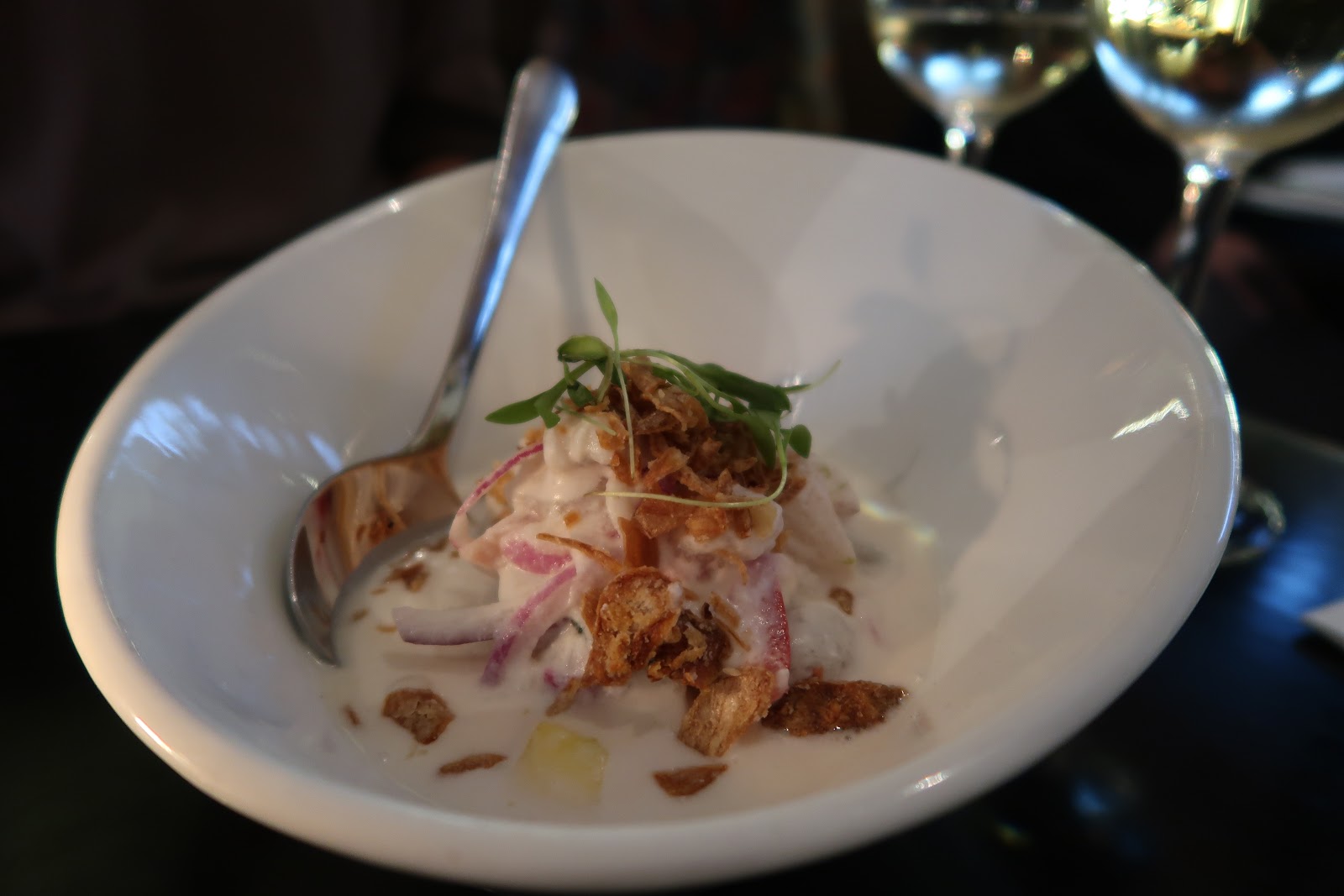 Dish after delicious dish was delivered to the table, each as complex, exciting and flavourful as the last. Sea bream ceviche with tigre de leche that was light and fresh, with flavours of citrus and ginger, slices of red onion and coconut milk. Panko-crumbed soft shell crab with a Singapore peanut curry sauce. Pan seared duck breast with a miso orange sauce and pickled vegetables. All the flavours were so varied and different, and yet they seemed to be cohesive – each mouthful from a different plate logically progressing into the next.